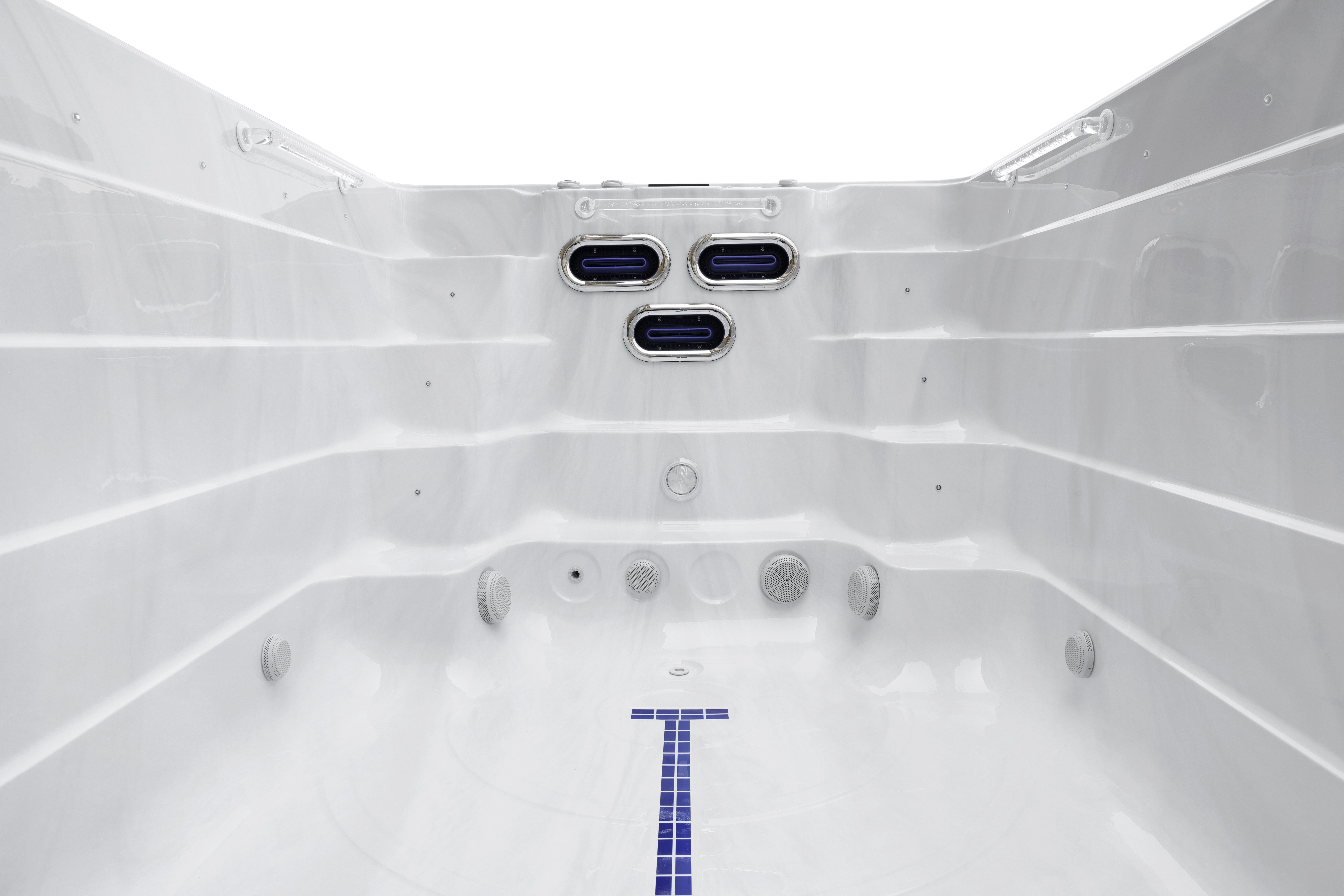 Три прозрачных поручня из пищевого пластика обеспечивают удобство и безопасность при перемещении между зонами и во время плавания.